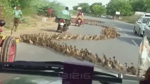 公路上的鸭子一会儿排成S形,一会儿排成B形